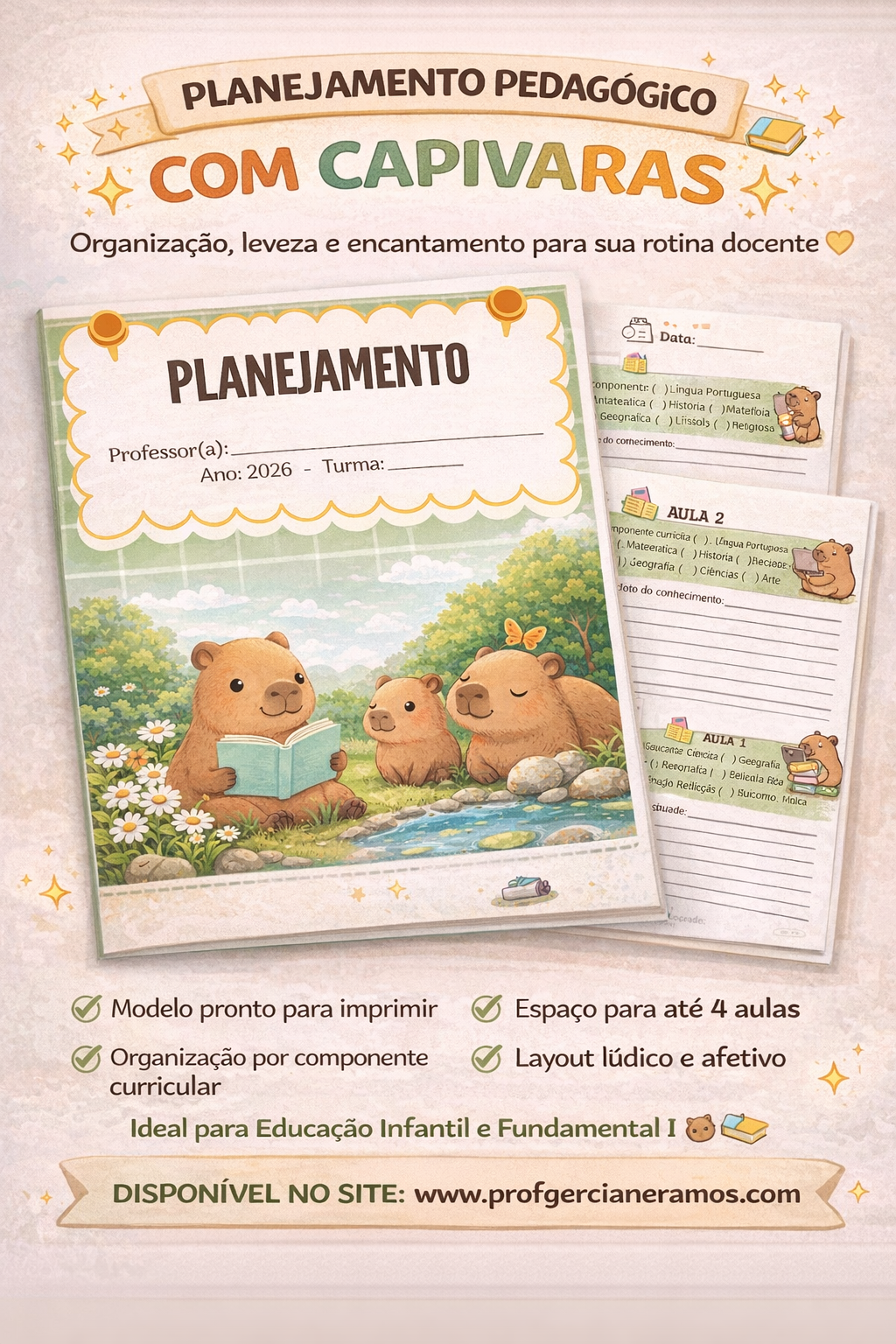 O Planejamento Pedagógico com tema Capivara foi desenvolvido especialmente para professores da Educação Infantil e Ensino Fundamental I que desejam unir organização e estética em seus registros pedagógicos.